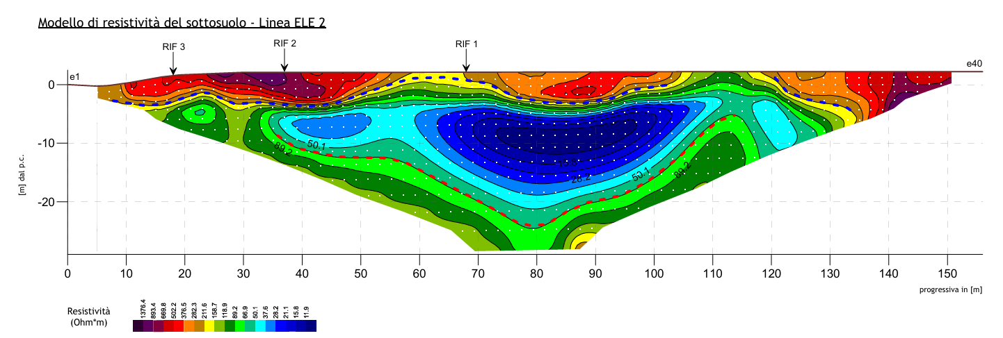 Dei quattro punti elencati, l’ultimo è certamente quello più critico. L’interpretazione del modello di resistività, ovvero l’assegnazione di un determinato materiale ad un particolare valore della resistività, produrrà un modello tanto più reale e preciso quanto maggiore sarà il numero di informazioni al contorno. La conoscenza, ad esempio, della stratigrafia di massima, del livello di falda, dei valori di resistività dei materiali presenti o di quant’altro, può concorrere a migliorare la risoluzione del modello finale. Le misurazioni vengono effettuate con sistemi hardware e software di ultima generazione. Il georesistivimetro è rappresentato dal sistema Electra della Moho srl dotato di 48 elettrodi espandibili con energizzazione in corrente alternata.